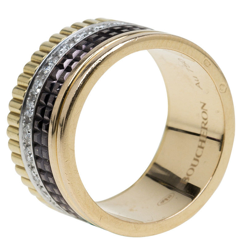 این انگشتر زیبا از طلای 18 عیار در سه رنگ و سرامیک مشکی حکاکی شده است.این انگشتر که با الماس تزئین شده است، دارای کتیبه مارک در پشت است.